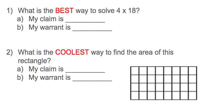 First, Dr. Cheng says that the crux of what mathematics is about, and what mathematicians actually do, is justification (p. 73). As she says, this is the difference between “what is 6 x 8?” and “why does 6 x 8 = 48?” I think students love this routine in part because it requires them to justify their ideas, rather than calculate (similar to a good Which One Doesn’t Belong?). Any task they’re given during class (via the curriculum) is generally asking them to calculate (and sometimes, as a sort of bonus, have some sort of justification for that calculation – but more along the lines of “make sure your answer is correct). I think it’s also a time for students to be able to meaningfully talk to each other about their math ideas in a decidedly non-evaluative and curious way.