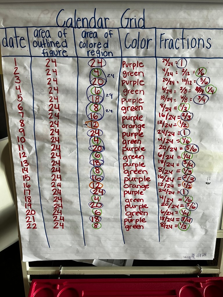 So then, what did they notice? A student I’d struggled to connect with immediately offered her prediction of a cyclical pattern with the fractions (we hadn’t reached the end of the first ‘cycle’ yet). The shock that came with the uncovering of the first orange shape was palpable. There was a lot of conversation attempting to predict when the next orange shape would come – some students thought that every 8 days, there would be a new color introduced. In the days to come, students noticed that the diagonals could be used to predict color and fractions, that every two days the total area added up to 24 (minus a couple outliers), and imagined how the outline of the shape might be manipulated in future dates to preserve the area of 24.