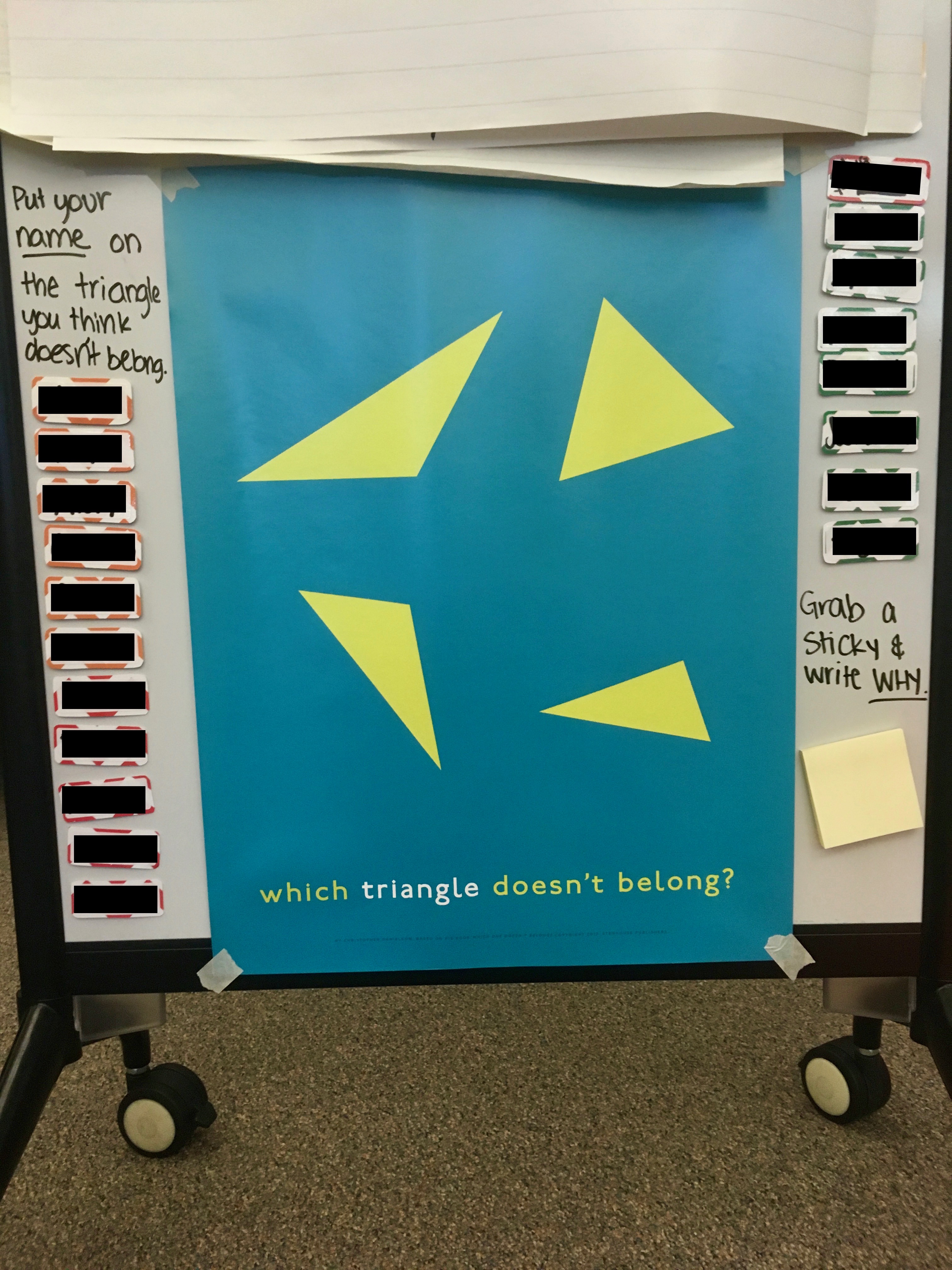 As we continued with this routine week after week, students’ reasoning became more sophisticated and their engagement increased as well – students would sneakily move their name to a shape during circle times and transitions. They would congregate around the poster, asking about and pushing back on each other’s choices.