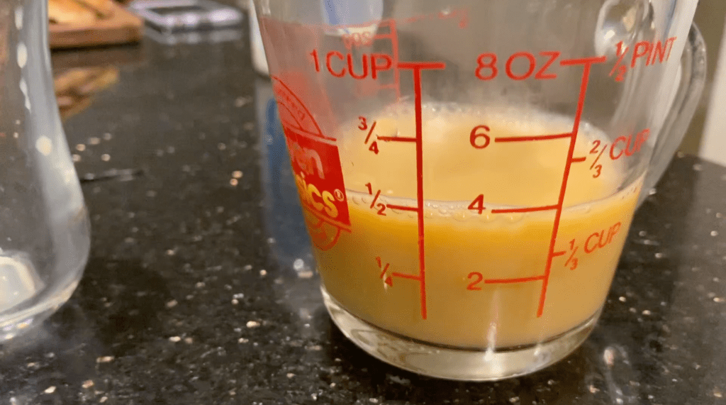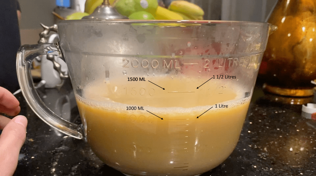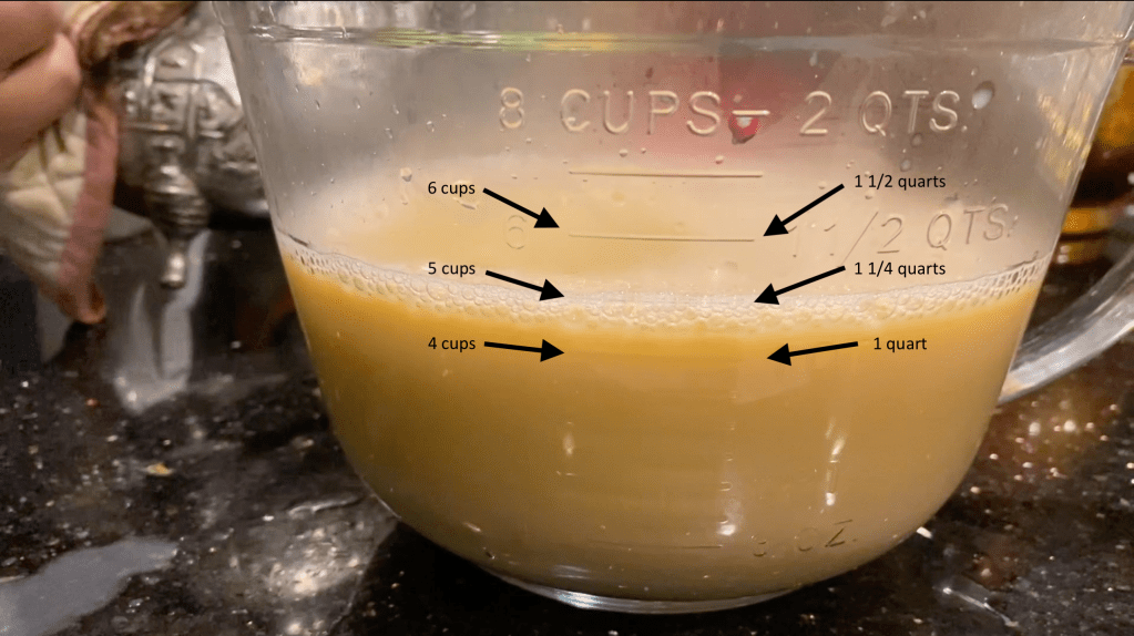 It’s hard to see exactly how much chai there is, although it is approximately 5 cups and partway between 1000 and 1500 mL. Here are two pictures to use for different units of measurement.